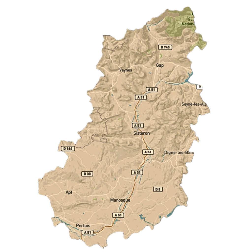 GAP 05000 – MANOSQUE 04100 – DIGNE-LES-BAINS 04000 – PERTUIS 84120 – SISTERON 04200 – LARAGNE-MONTÉGLIN 05300 – FORCALQUIER 04300 – CHÂTEAU-ARNOUX-SAINT-AUBAN 04160 – ORAISON 04700 – GRÉOUX-LES-BAINS 04800 – APT 84400 – VILLENEUVE 04180 – VOLX 04130 – PEYRUIS 04310 – LES MÉES 04190 – VALENSOLE 04210 – SAINTE-TULLE 04220 – CORBIÈRES-EN-PROVENCE 04220 – MOUSTIERS-SAINTE-MARIE 04360 – RIEZ 04500 – ORCIÈRES 05170 – TALLARD 05130 – CHORGES 05230 – SAINT-BONNET-EN-CHAMPSAUR 05500 – LUS-LA-CROIX-HAUTE 26620 – SÉDERON 26560 – MONTBRUN-LES-BAINS 26570 – SAULT 84390 – GORDES 84220 – LOURMARIN 84160 – CUCURON 84160 – CADENET 84160 – LA ROQUE-D’ANTHÉRON 13640 – LE PUY-SAINTE-RÉPARADE 13610 – MEYRARGUES 13650 – PEYROLLES-EN-PROVENCE 13860 – JOUQUES 13490 – SAINT-MICHEL-L’OBSERVATOIRE 04870 – BANON 04150 – CÉRESTE-EN-LUBERON 04280 – REILLANNE 04110 – VALBENS 04200 – SAINT-ÉTIENNE-LES-ORGUES 04230 – CRUIS 04230 – ONGLES 04230 – SIMIANE-LA-ROTONDE 04150